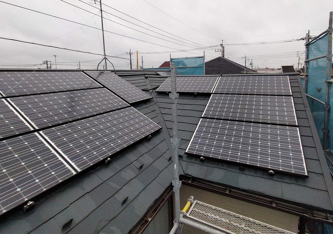 近年注目されているオール電化。それにともない太陽光発電システムを屋根に取りつけたいという依頼が増えています。太陽光発電システムとは、太陽の光を太陽電池に吸収して電気に変える発電システムです。メインの機器となるのは太陽電池を配置した「太陽電池パネル」と、発電した電気を家庭用の電力に変換する「パワーコンディショナ」の2つ。そのほかにも接続箱・発電モニター・電力売買電メーターなどが必要になります。